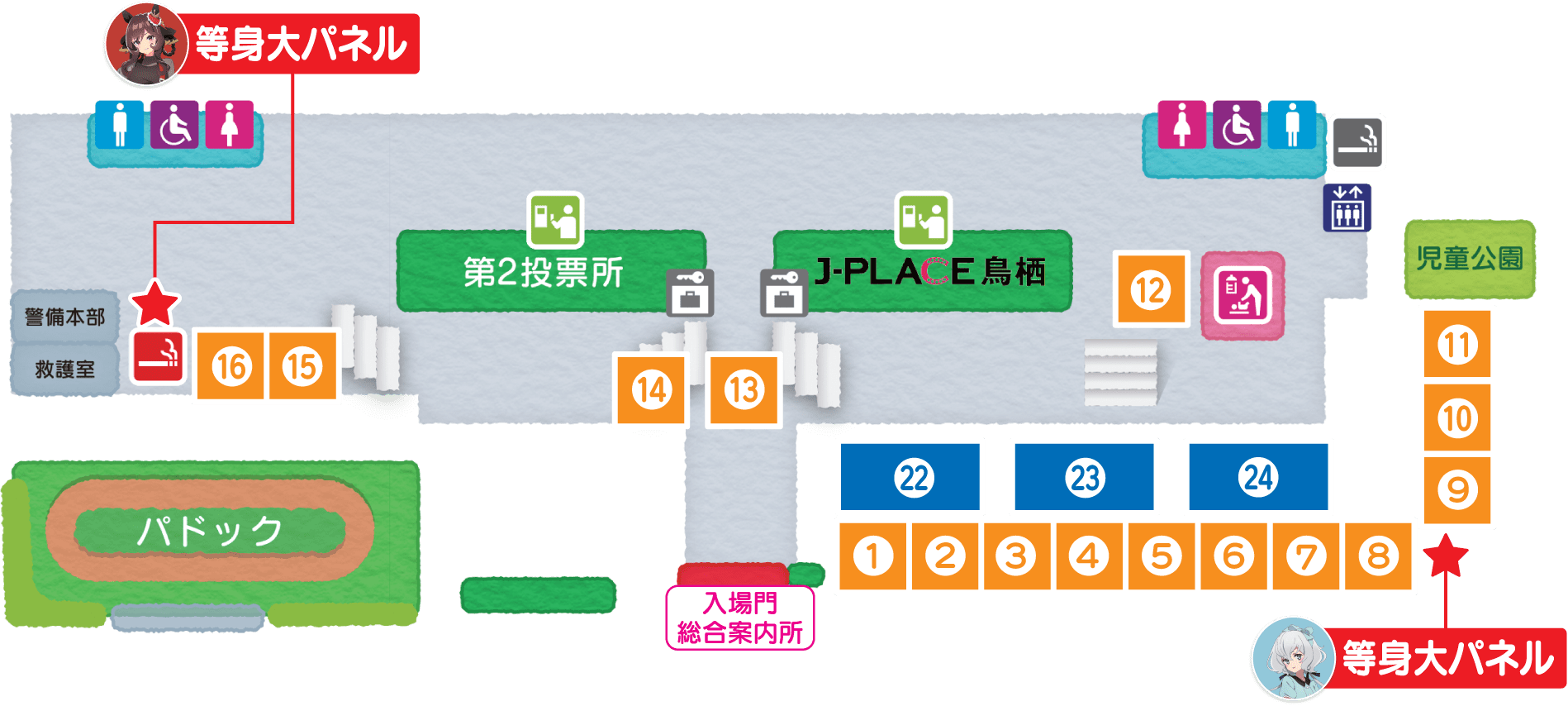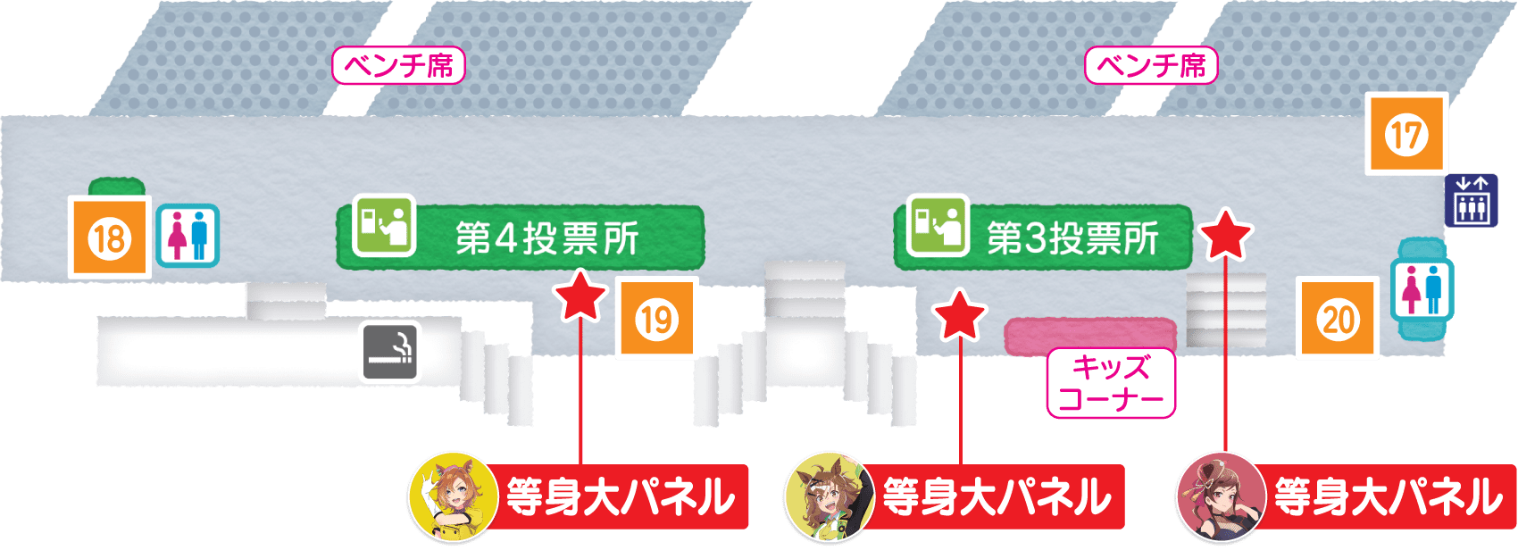 フォトスポット設置 キャラクターの等身大パネルを各箇所に設置します!ウマ娘やフランシュシュメンバーと一緒に写真撮影をしよう!※上記エリアMAPの★箇所が等身大パネルの位置となっています。